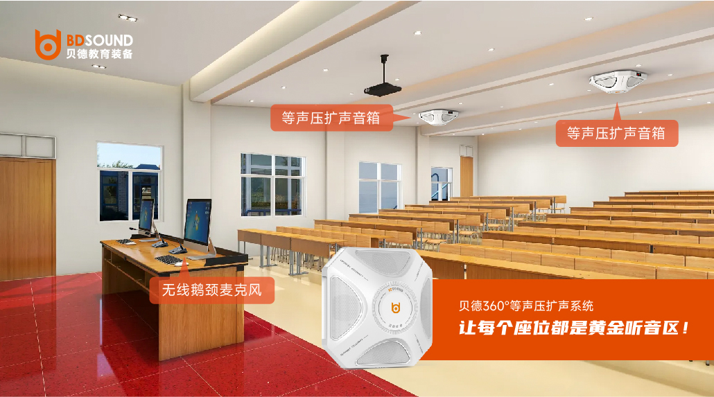貝德多功能等聲壓一拖五音箱 BD-H0361F,是一款等聲壓健康擴聲系統音箱,聲能35°向下輻射,聚焦在人體,增加漫反射+強吸聲,無需聲場設計,座位布局中心向四周等聲壓均勻覆蓋,系統自適應算法,傳聲增益最大化,一體式設計,高度集成化,插電即用,開機即用,免調試,“0”布線,秒級部署,無線互聯,高效會議零負擔,標配話筒類型豐富,無線頭戴、無線領夾、無線鵝頸、無線手持。